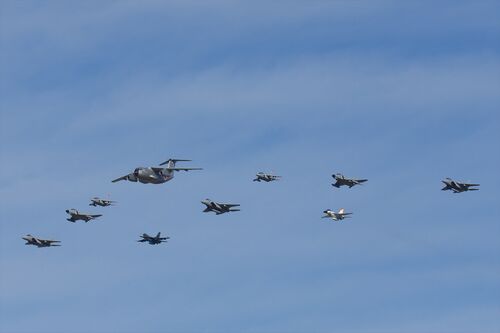 岐阜基地航空祭、今回は異種混合航過飛行からです! コールサイン『マンボーフライト』が近づいてきました。大きく等間隔に広がって飛行する様子はまるでマンボウですね。 KC-767による航過機動。まずは宮中給油のノズルをおろして空中給油風に。 そしてKC-7…